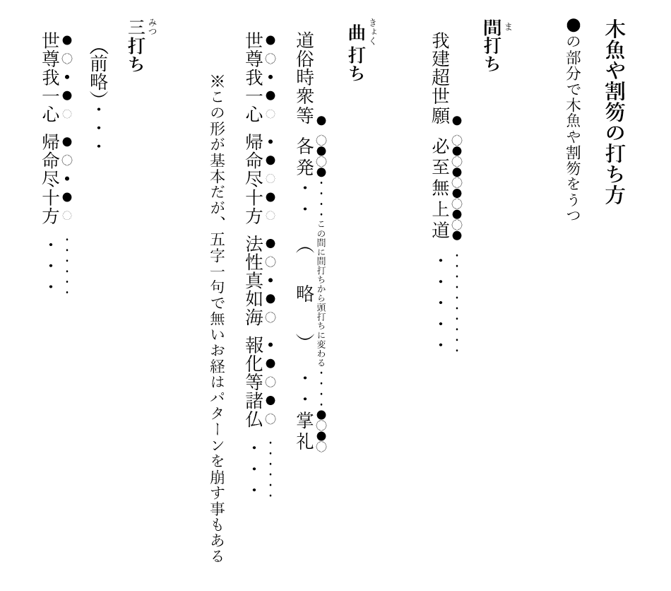 わが宗派では、「間打ち」という打ち方を行い、文字と文字の間に木魚を打つのが基本となります。一般的には「裏打ち」と言われる様な打ち方です。